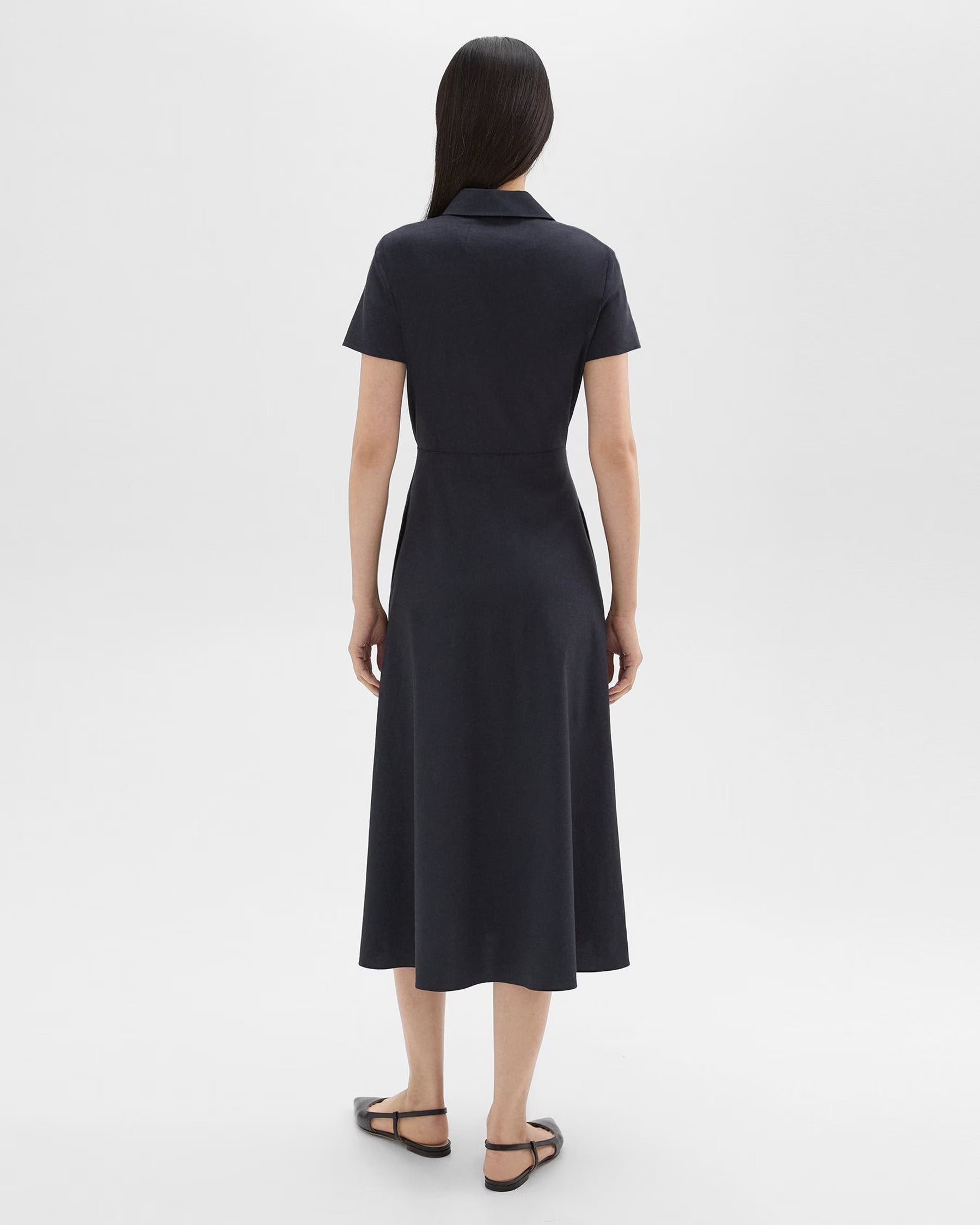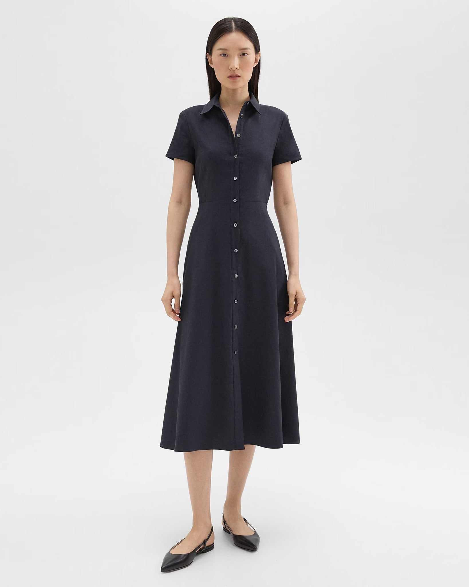 Tailored to achieve a fit-and-flare silhouette, this midi dress is buttoned up the front to meet a pointed collar.