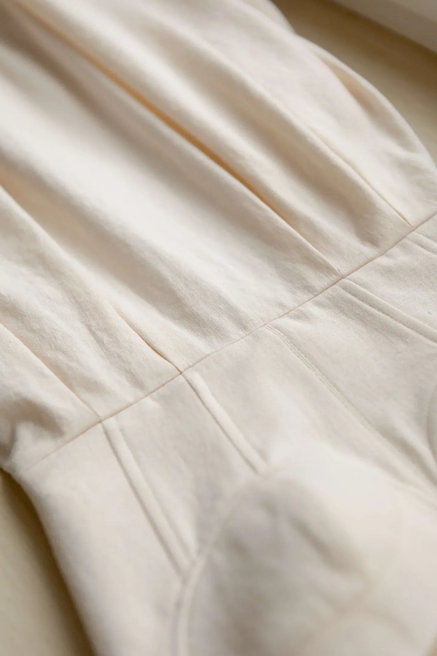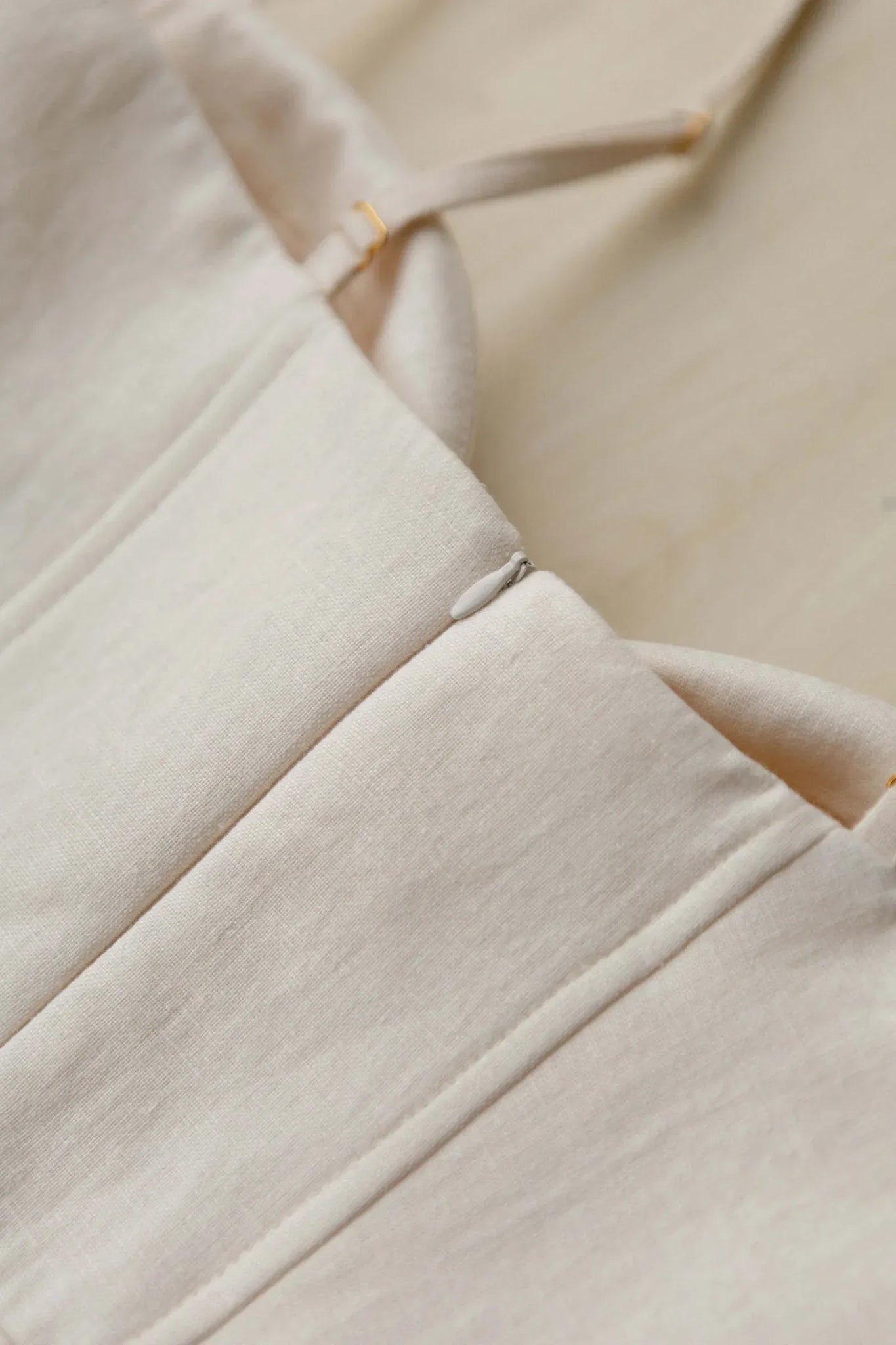 The Bardot Linen Wedding Dress is crafted from sustainable linen, featuring a chic square décolleté, a fitted waist that flows into a full skirt with a voluminous overlay, and an open scoop back.