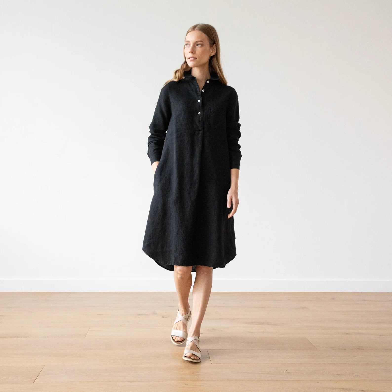 With a fluid, drapey silhouette and long sleeves, our Camilla linendress is versatile, comfortable and effortlessly stylish. Thanks to the understated gathered detailing to the cuffs and back, delicate buttons and two handy pockets, this linen dress works as beautifully on a summer picnic as in the office.
